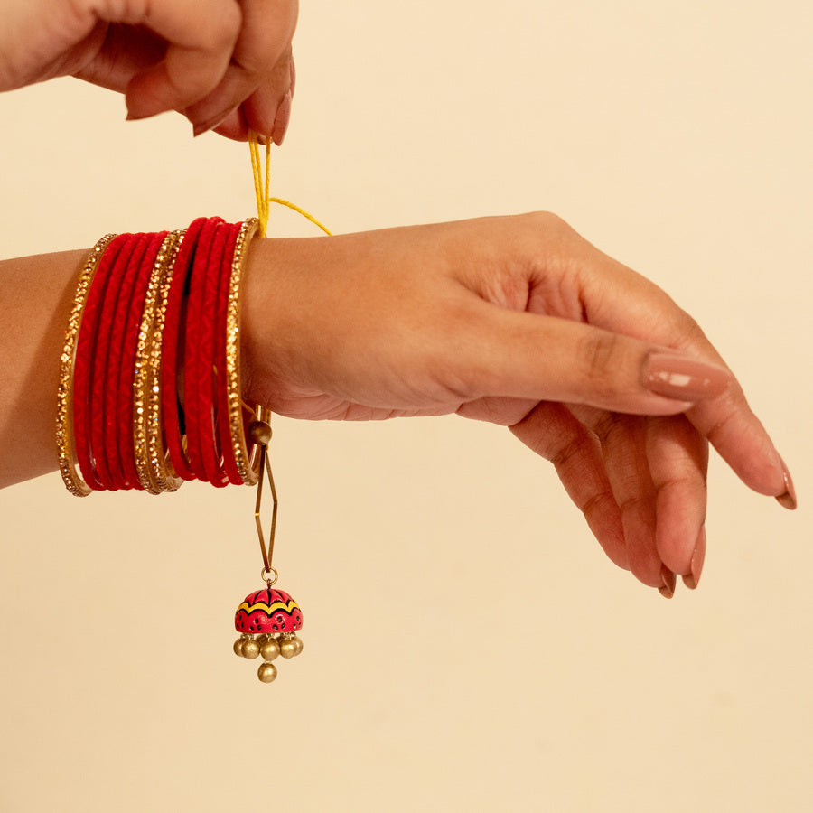 A Rakhi set that’s as adorable as your Bhaiya-Bhabhi!! This Bhaiya-Bhabhi Rakhi box is more than just rakhis. It’s a small bundle of love. It has a special wealth stone rakhi for your brother and a lumba rakhi for your bhabhi that doubles up as an earring. We’ve even added a matching second jhumka to make it a full pair for your Bhabhi. This Rakshabandhan special box is sweet, thoughtful, and makes Rakhi extra special for both of them.