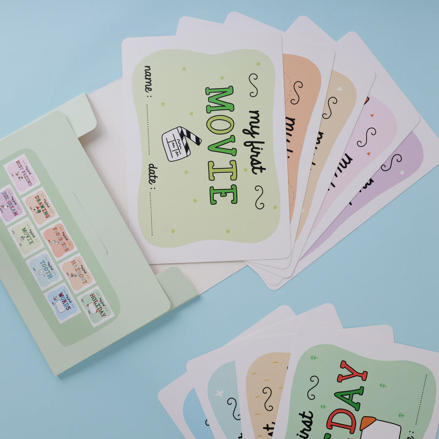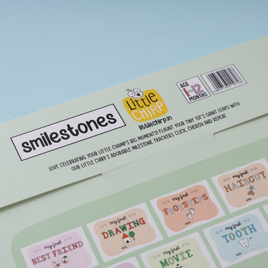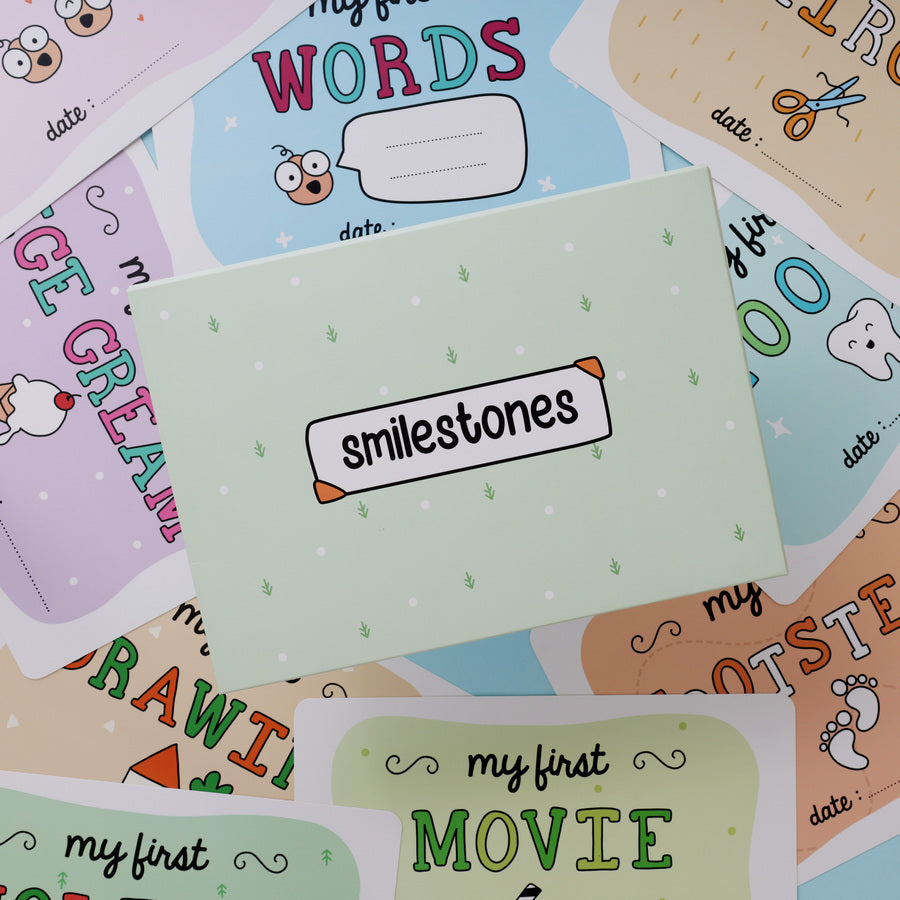 Introducing Smilestones - a set of 9 placards, each celebrating a special milestone of your baby. From their first tooth to their first movie, each placard has space to jot down the date and mark every moment with love and joy. These placards are perfect for documenting your baby’s sweet milestones and creating memories that last a lifetime.