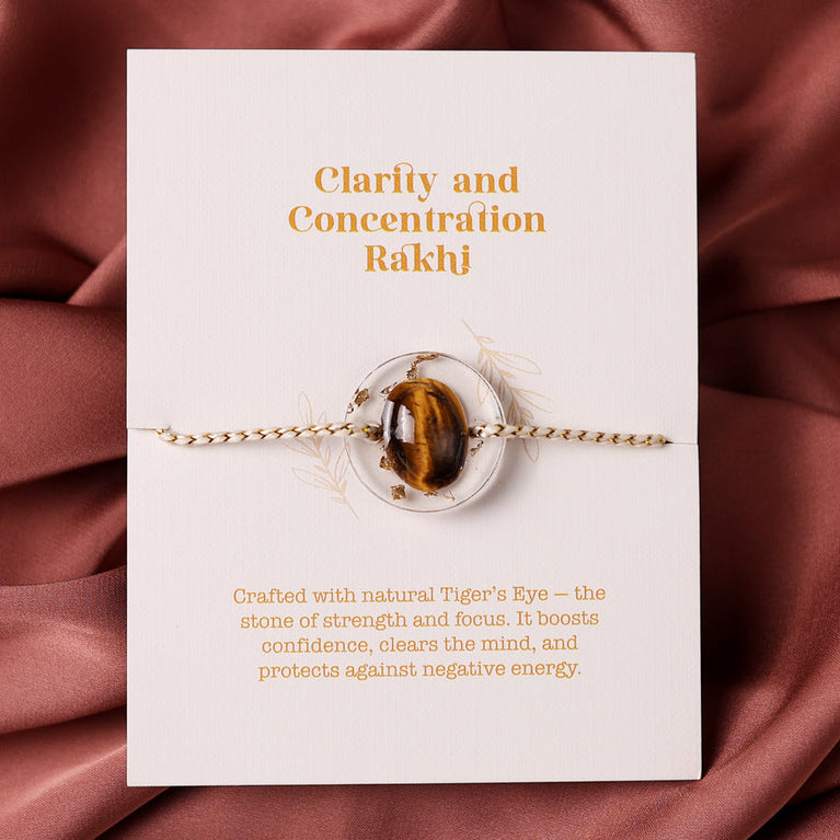 This Clarity and Concentration Rakhi is crafted with natural Tiger’s Eye, the stone of strength and focus. Known for boosting confidence, clearing the mind, and protecting against negative energy, this rakhi helps sharpen your brother's clarity and concentration.The Tiger’s Eye stone is authentic and certified by the Gemological Institute (certificate not included with the Rakhi).Tie this rakhi to your brother and empower him with focus, strength, and positive energy this Raksha Bandhan.Size: 3 x 3 cm