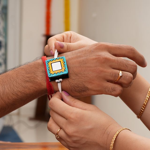 Meet our bestselling ‘Secret Photo Rakhi’ – crafted from eco-friendly terracotta, customized with 6 personalized photos, and designed to be reused as a fridge magnet.This unique rakhi is shaped like a tiny square box that secretly holds cherished photographs. Simply open the rakhi to reveal the magical memories inside.For an extra touch, you can also add your brother’s initials to the rakhi. Specifications:
