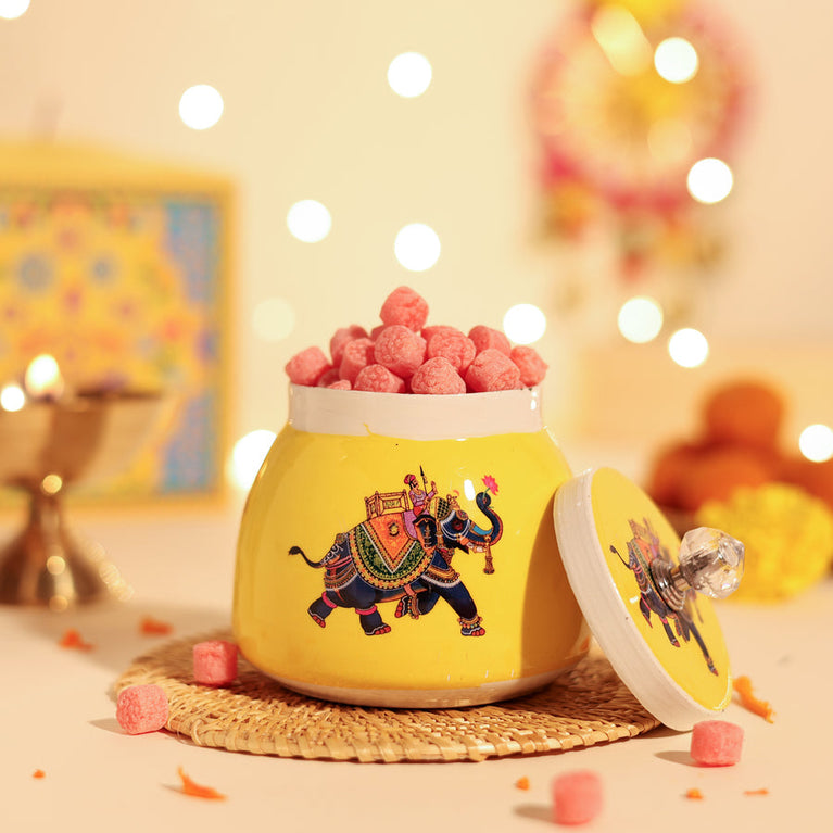 Introducing India’s First Patakha Box — a one-of-a-kind festive surprise that looks like a cracker but opens up as a magical hamper. It’s designed to give you the joy of lighting something special without any noise, or pollution.Celebrate Diwali with a thoughtfully curated hamper that includes:Paan candyLaddoo CandlesIncense ConesA beautiful Greeting CardDesigner Colorful DiyaHow It Works :The Patakha Box is simple and safe to use:Light the wick or pull it gently.Watch the box unfold in a magical way.Experience the joy of festive unboxing with none of the mess or worry.Specifications -Size of the box: 14 cm X 14 cm X 14 cm