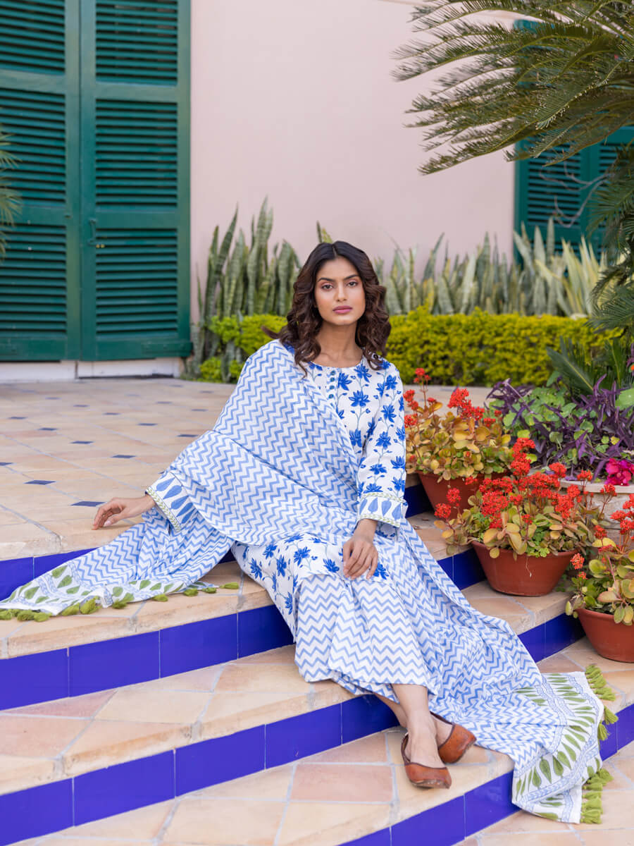 Blue Chevron Block Printed Cotton Palazzo