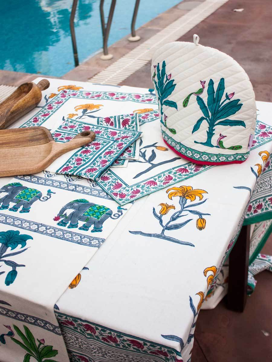 A set of six hand block print table mats on cotton canvas in our signature design. Make a set with our matching selection of table cloth, table runner, table napkins, tea cozy, and more.