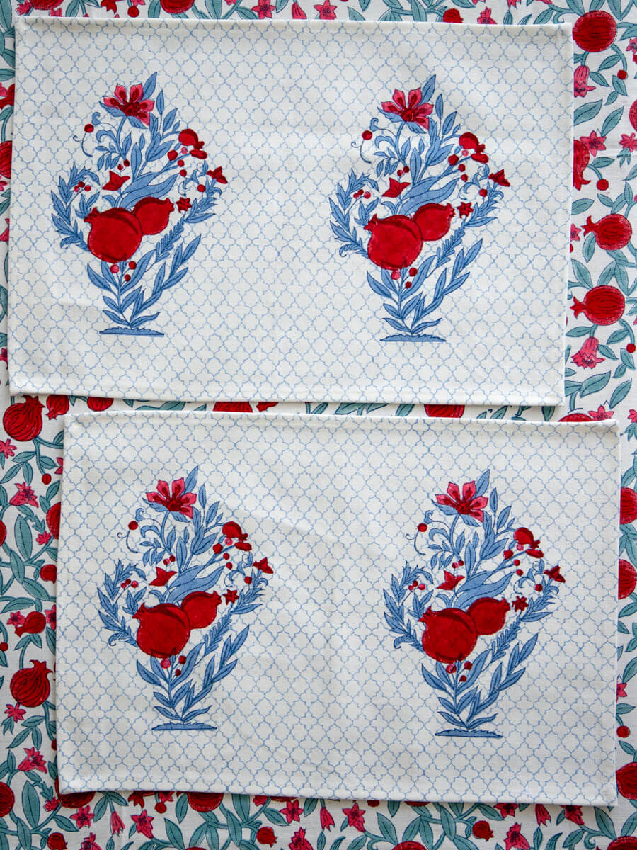 A set of hand block print table mats on cotton canvas in our signature design. Make a set with our matching selection of table cloth, table runner, table napkins, tea cozy, and more.