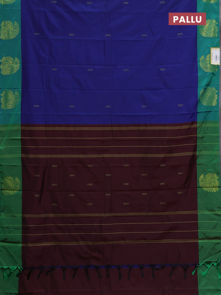 Arani semi silk saree blue and dual shade of green with copper zari woven buttas and copper zari woven butta border