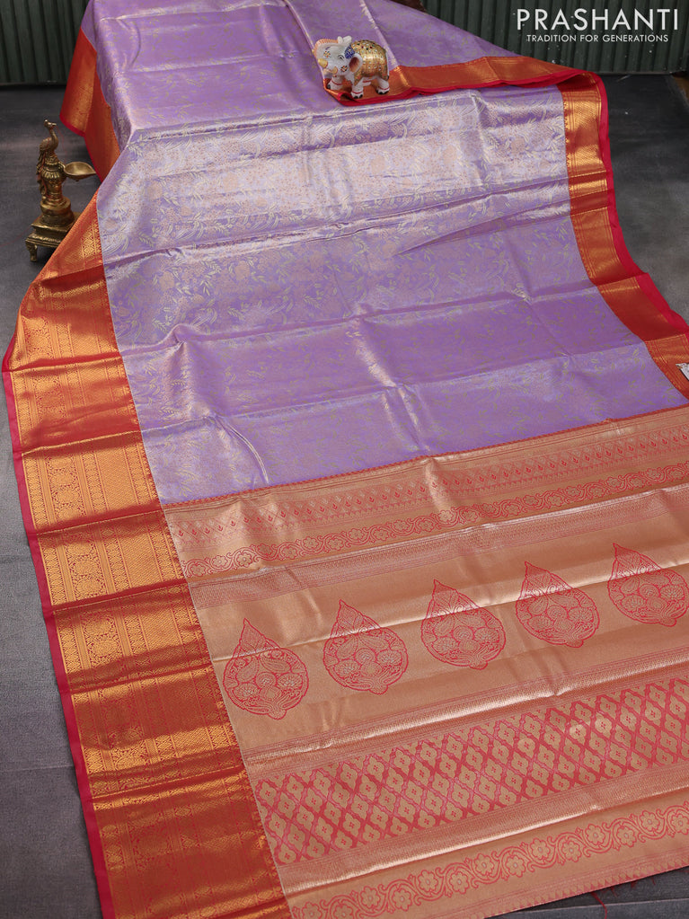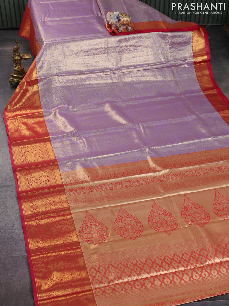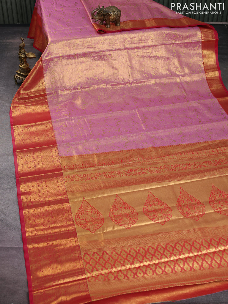 Bangalori tissue silk saree lavender and reddish pink with allover zari woven brocade weaves and long zari woven border