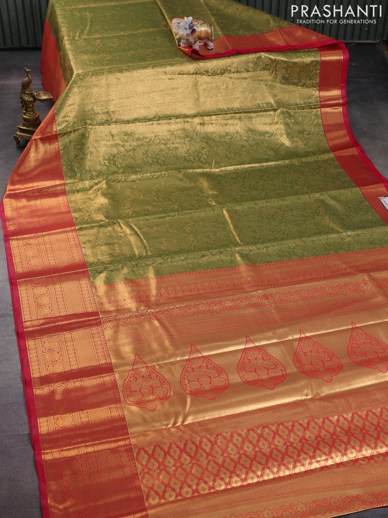 Bangalori tissue silk saree green and red with allover zari woven brocade weaves and long zari woven border