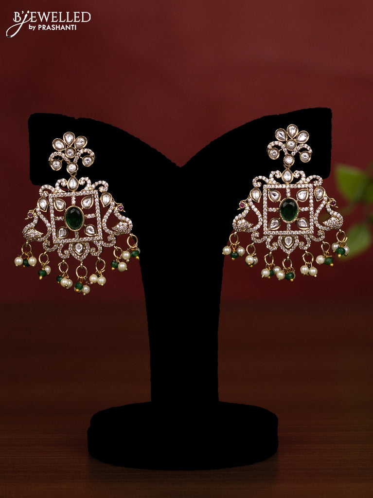 Beaded multilayer green necklace with emerald kundan & cz stones and pearl & beads hanging in victorian finish