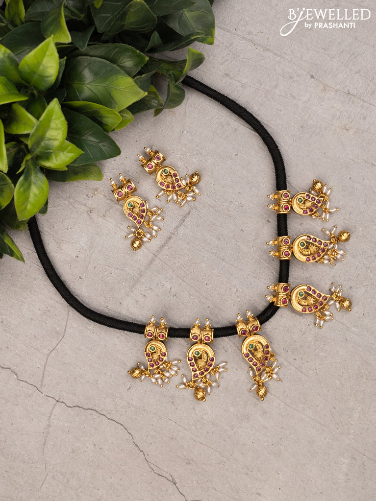 Black thread necklace lakshmi design with kemp & cz stones and golden beads hanging without earrings