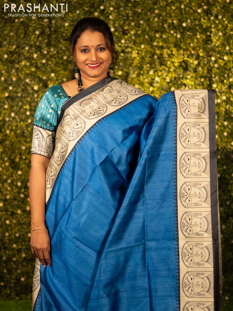 Chappa saree blue and beige with allover small zari checked pattern and madhubani printed pallu