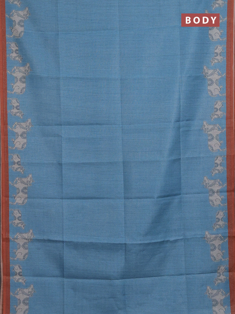 Chappa saree light blue and rust shade with allover small zari checked pattern and pichwai printed pallu