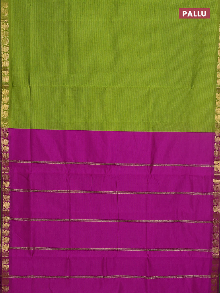 10 yards Poly cotton saree green and magenta pink with plain body and zari woven border