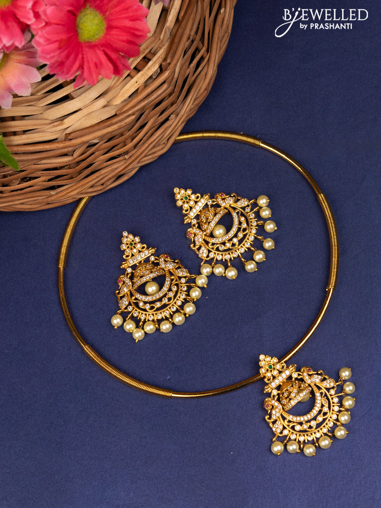 Antique ring type choker peacock design with kemp & cz stone and pearl hangings