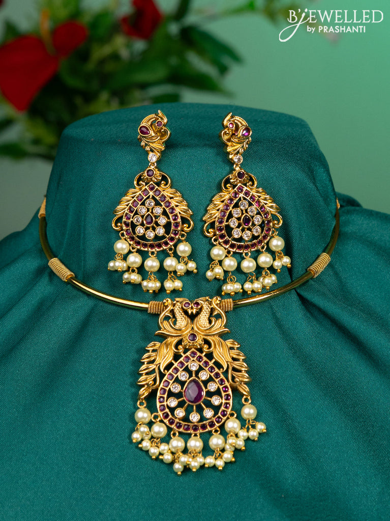 Antique ring type choker peacock design with pink kemp & cz stones and pearl hangings