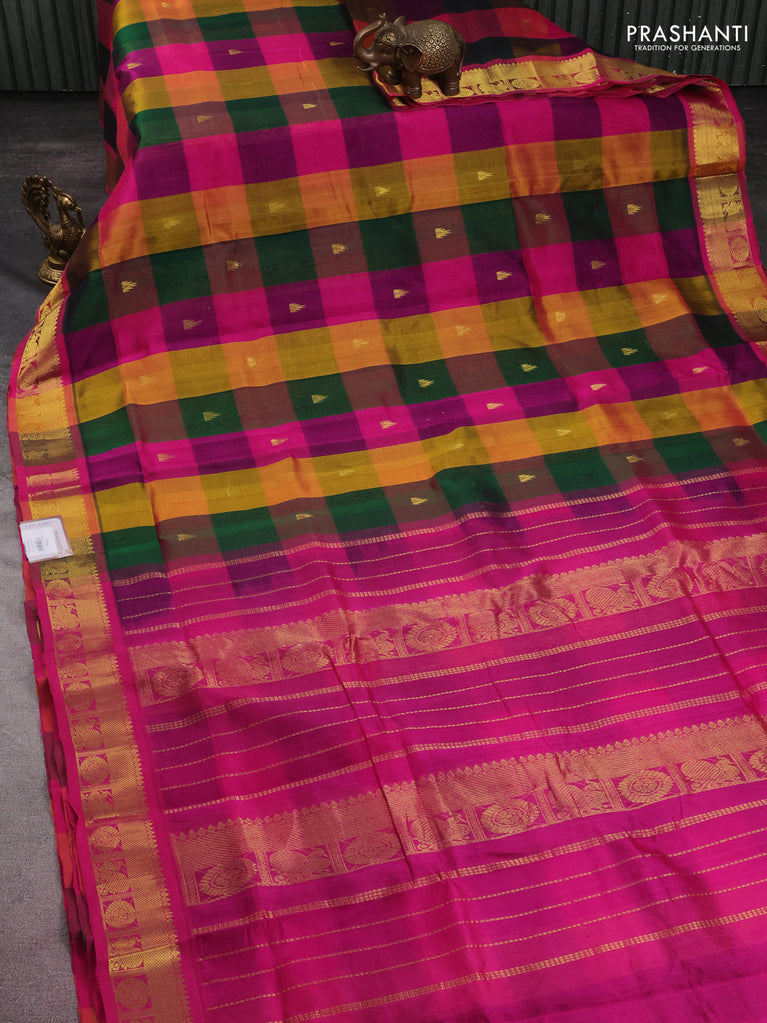 10 Yards silk cotton saree multi colour and pink with allover paalum pazhamum checks & zari buttas and rudhraksha & annam zari woven border