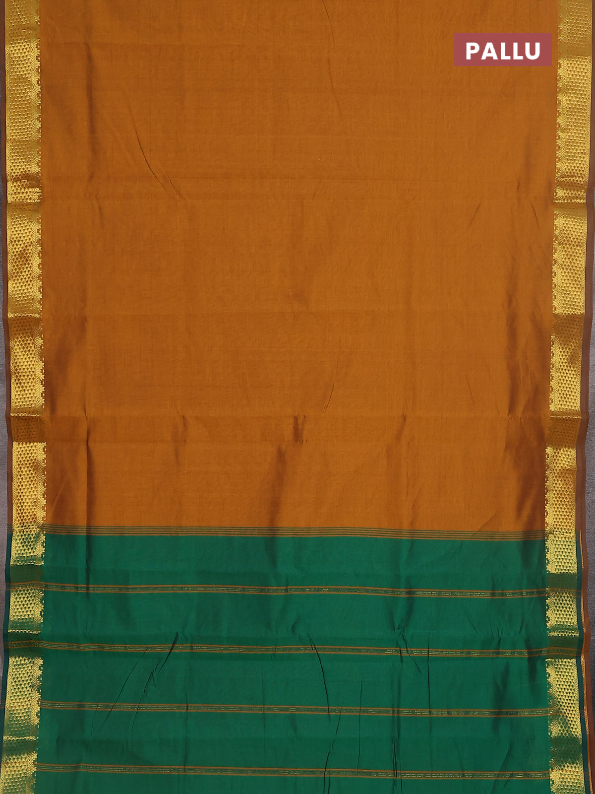 10 yards Poly cotton saree dark mustard and green with plain body and zari woven border