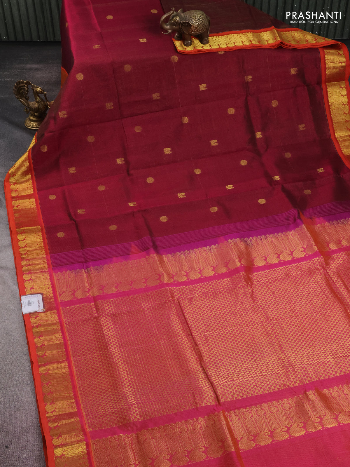 10 yards silk cotton saree maroon and dual shade of pinkish orange with allover vairaosi pattern & zari buttas and zari woven border
