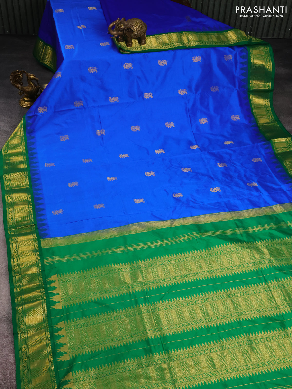 10 Yards silk saree blue and green with zari woven buttas and temple design zari woven border