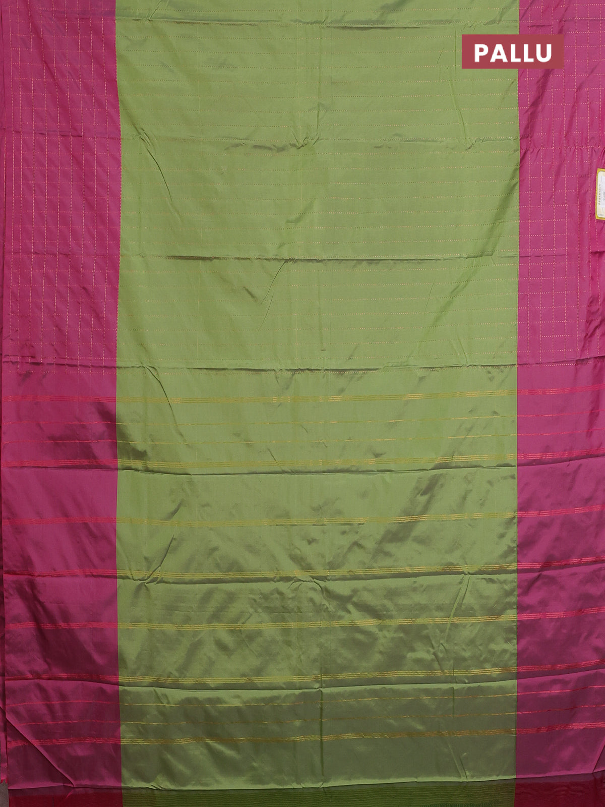 Arani semi silk saree green and magenta pink with allover copper zari weaves and zari checked border