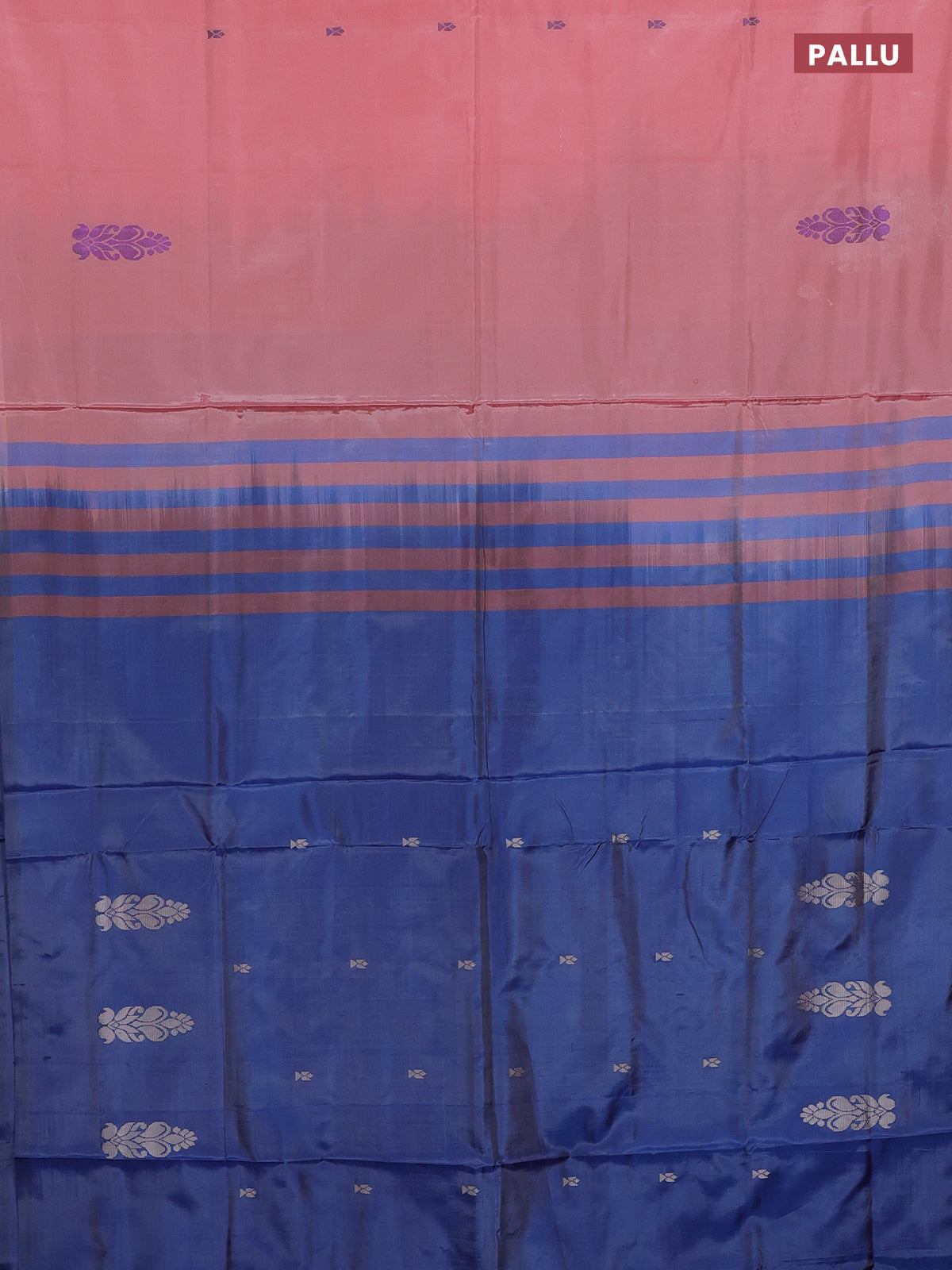Banana pith saree peach shade and blue with thread woven buttas in borderless style