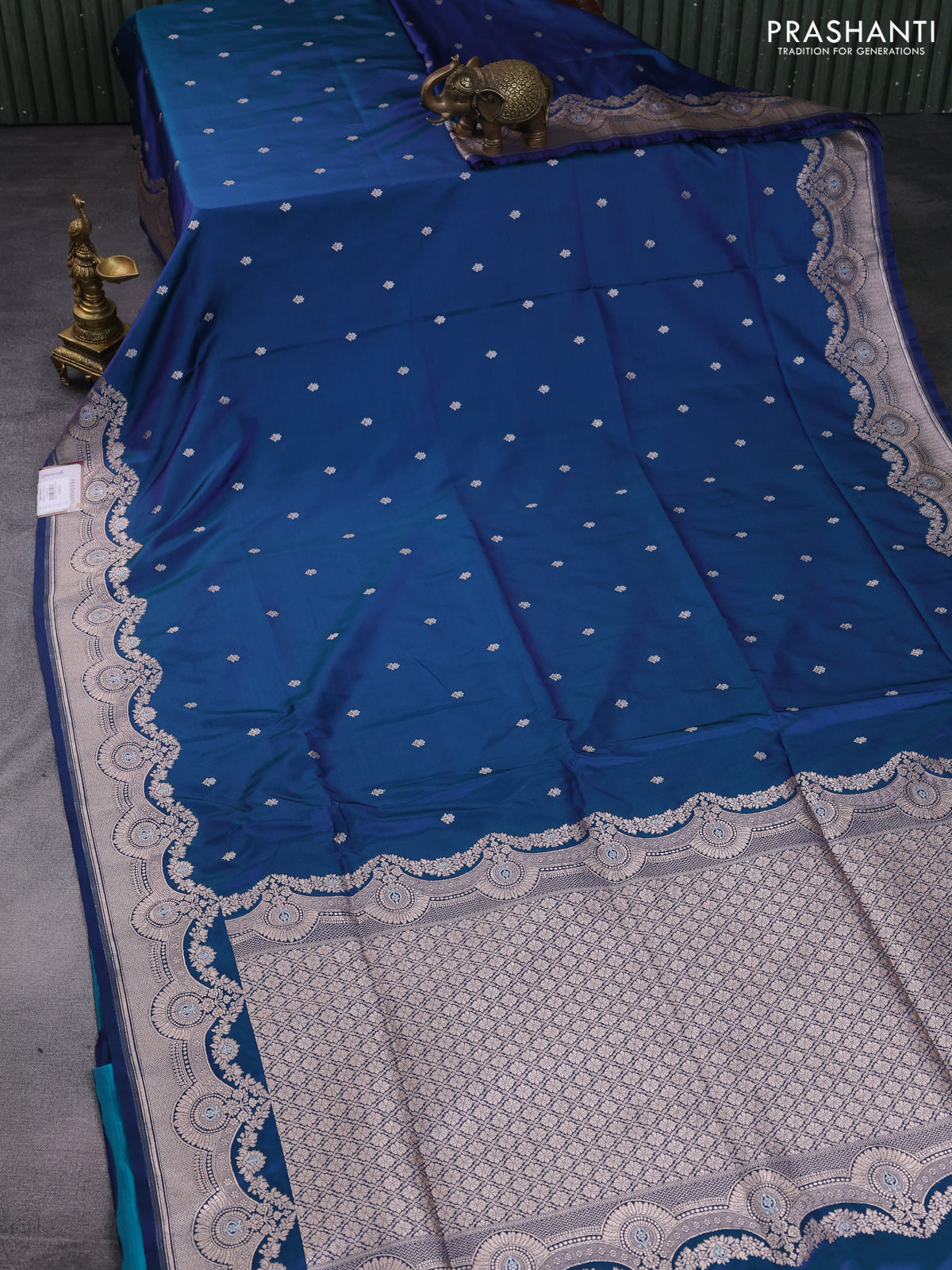 Banarasi semi katan saree dual shade of peacock blue with silver & gold zari woven buttas and rich zari woven border
