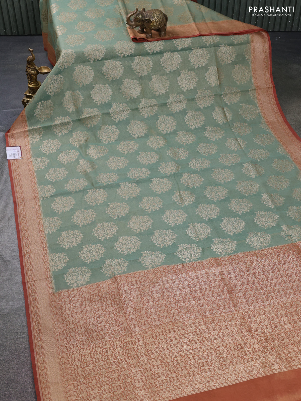 Banarasi tissue silk cotton saree pastel green and rust shade with allover thread & zari woven butta weaves and woven border