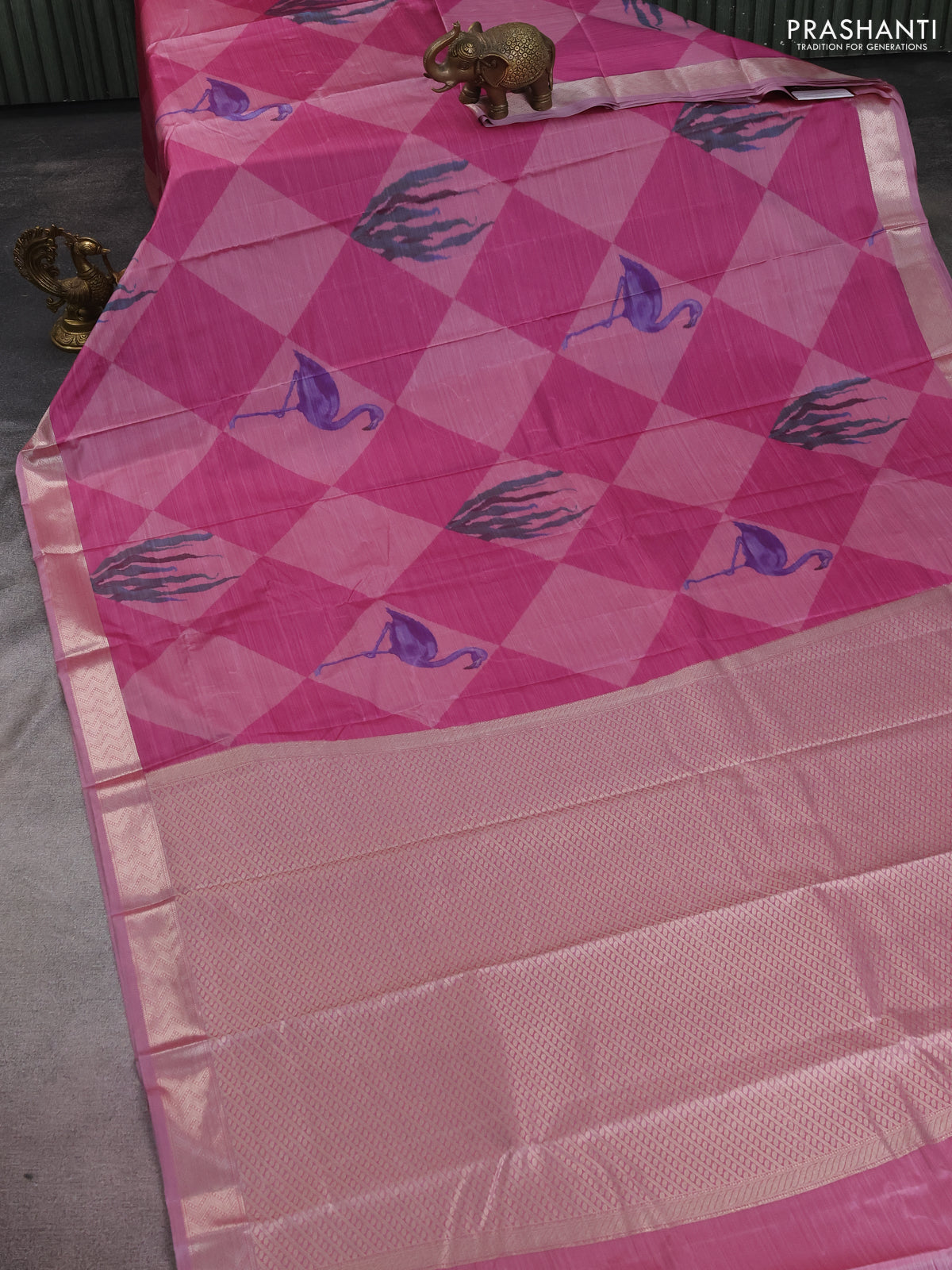 Bangalori semi silk saree pastel pink and magenta pink with allover ikat weaves and zari woven border
