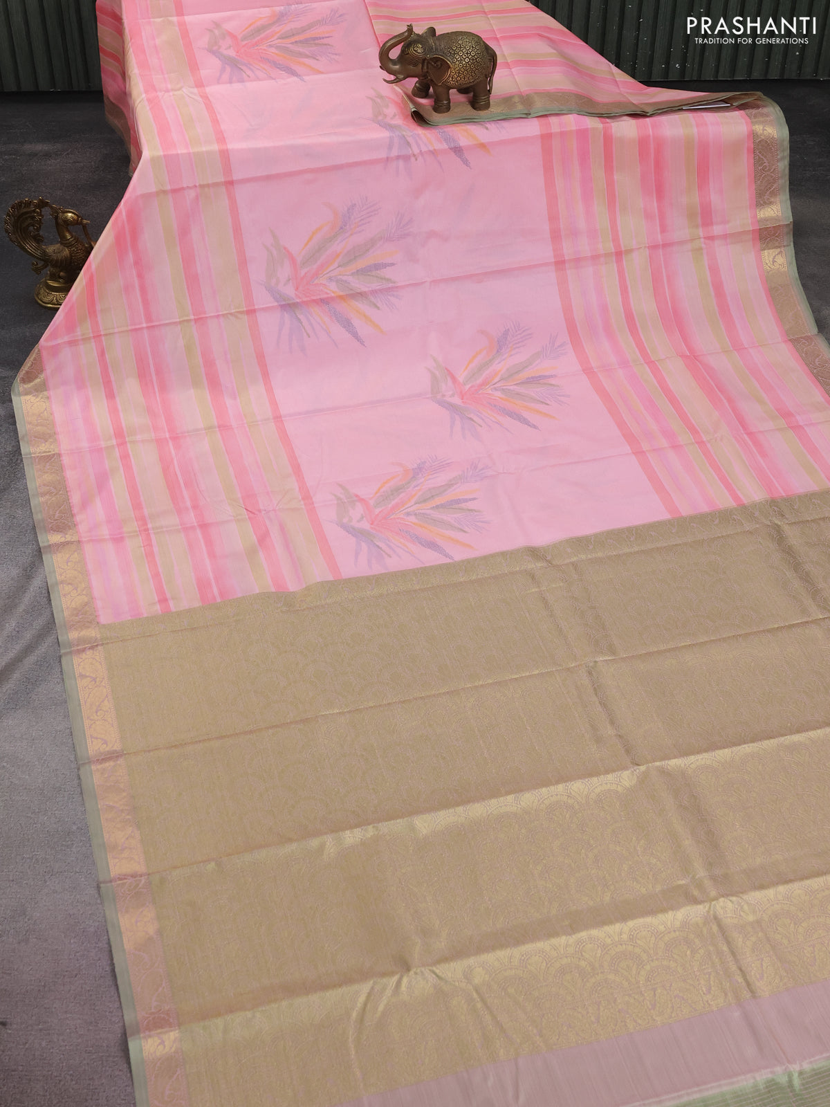 Bangalori semi silk saree peach pink shade and green with allover ikat weaves and zari woven border