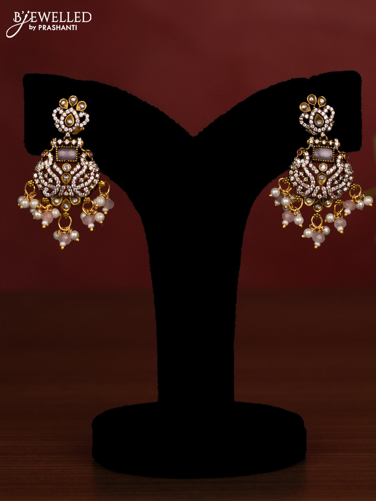 Beaded triple layer baby pink necklace with cz stones and pearl & beads hanging in victorian finish
