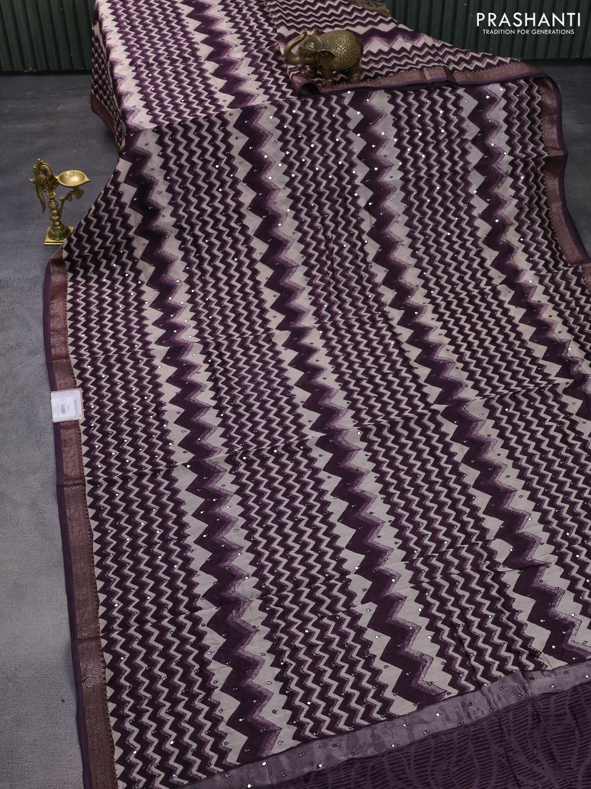 Chanderi silk cotton saree wine shade and beige with allover zig zag prints & mirror work and woven border