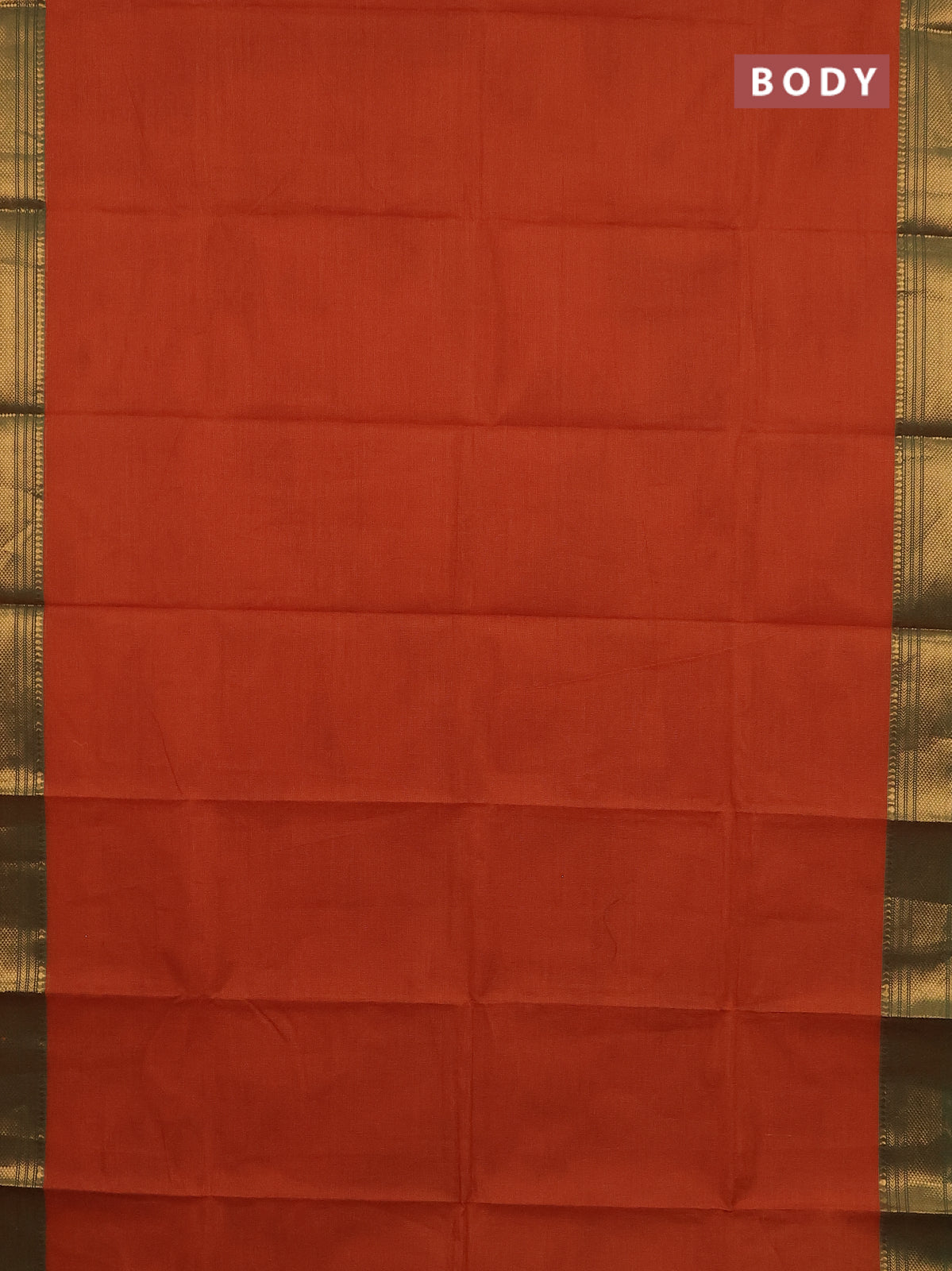 Chettinad cotton saree rust shade and green with allover small checked pattern and zari woven border