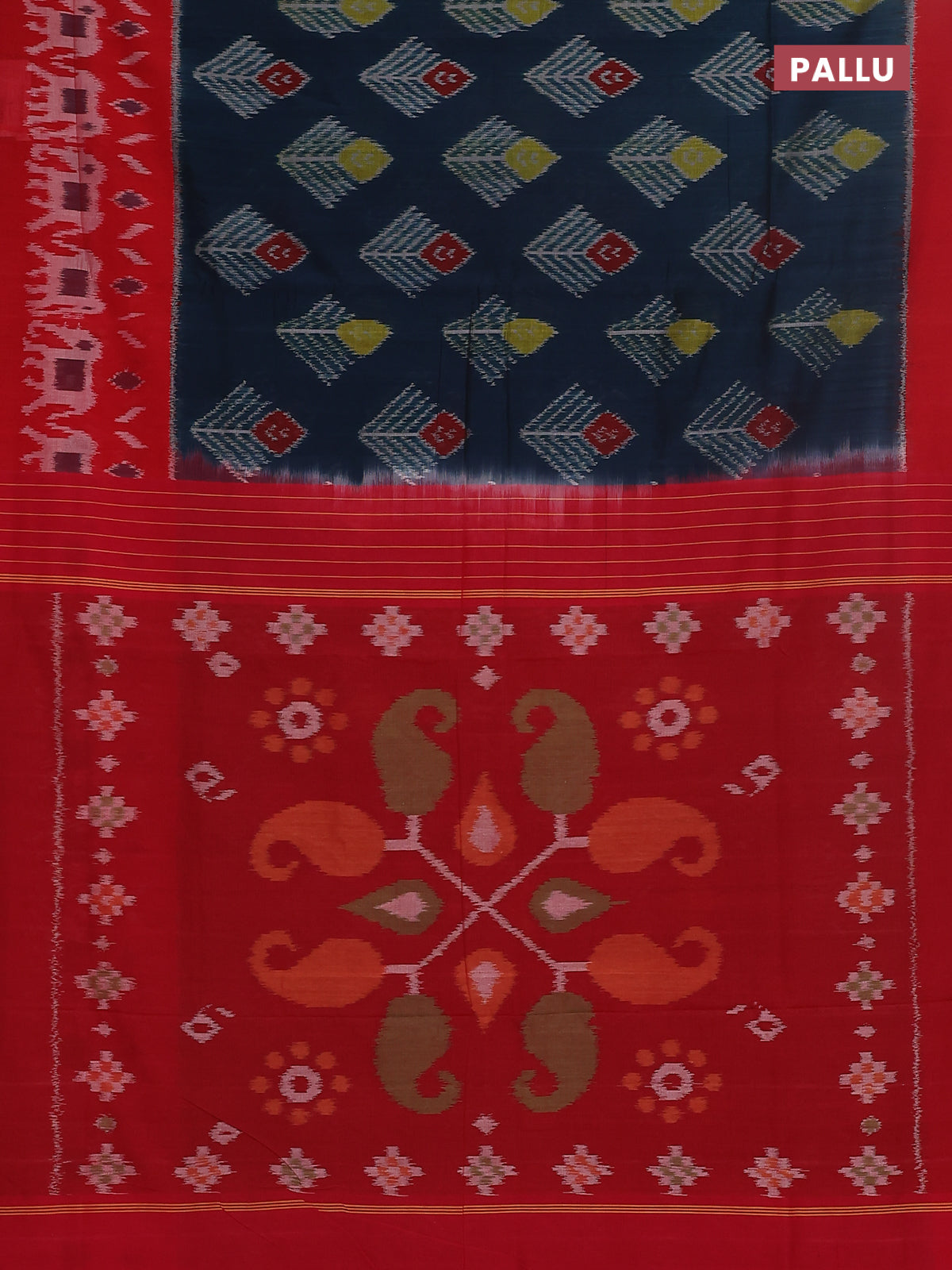 Ikat cotton saree peacock blue and red with allover ikat butta weaves and long ikat style border