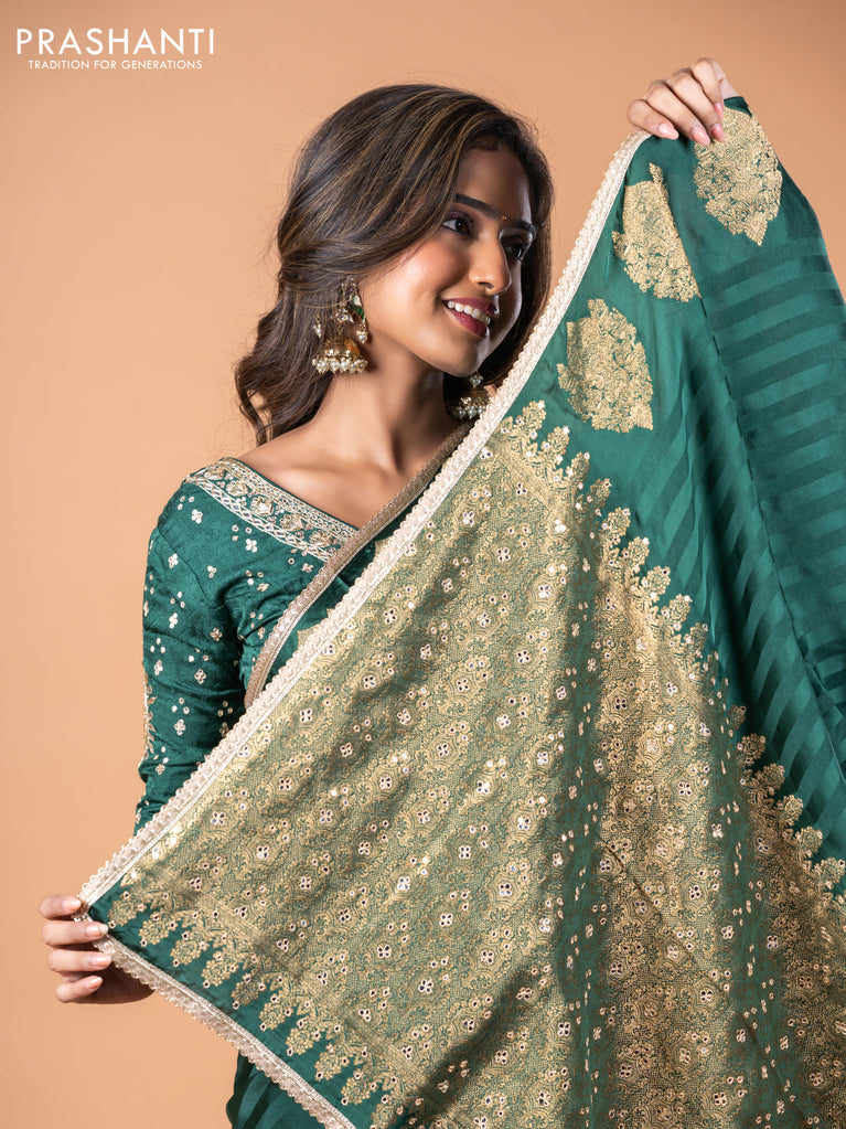 Banarasi crepe saree green with stripes pattern and mirror work & banarasi style border