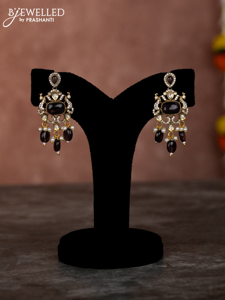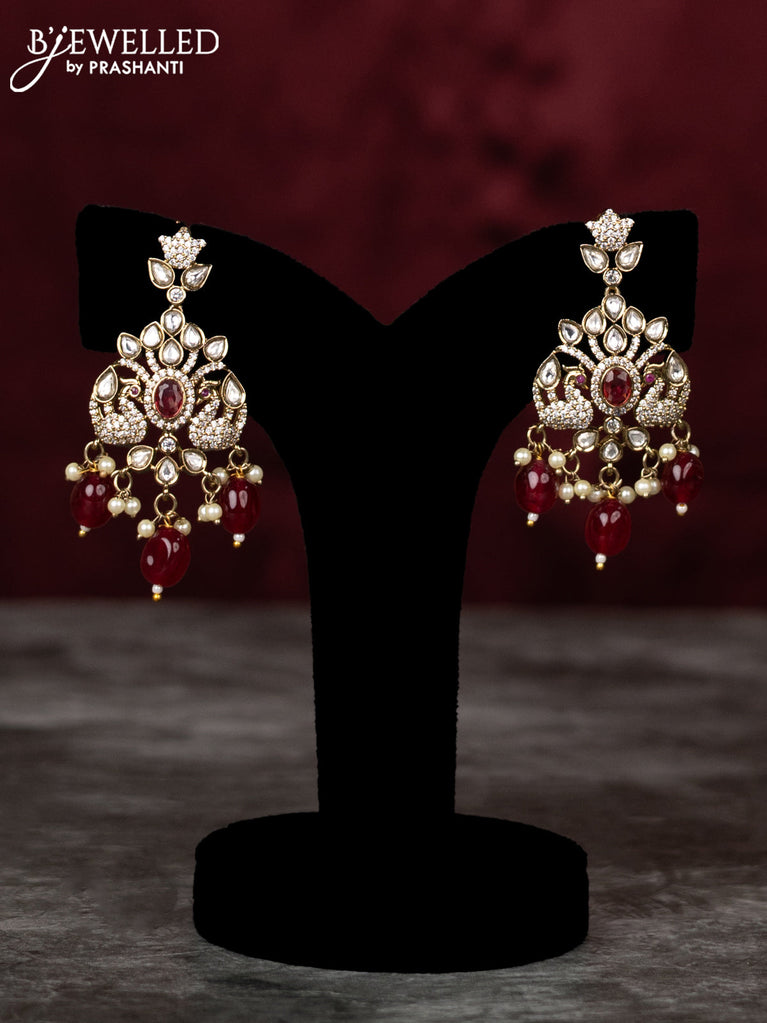 Beaded maroon necklace peacock design with ruby & cz stones and pearl & beads hangings in victorian finish