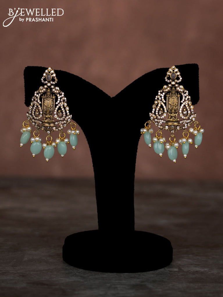 Beaded double layer mint green necklace tirupati balaji pendant with cz stones and pearl & beads hangings in victorian finish