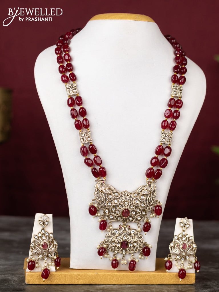 Beaded double layer maroon haram peacock design with ruby & kundan cz stones and pearl & beads hangings in victorian finish