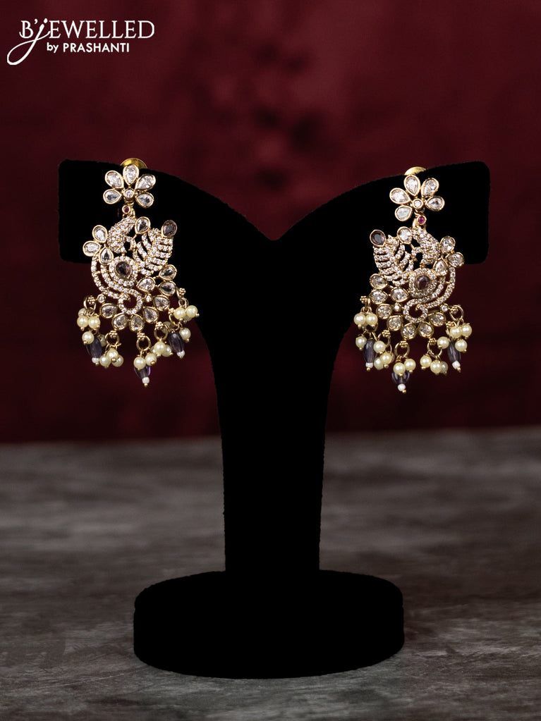 Beaded double layer purple necklace with kundan & cz stones and pearl hangings in victorian finish