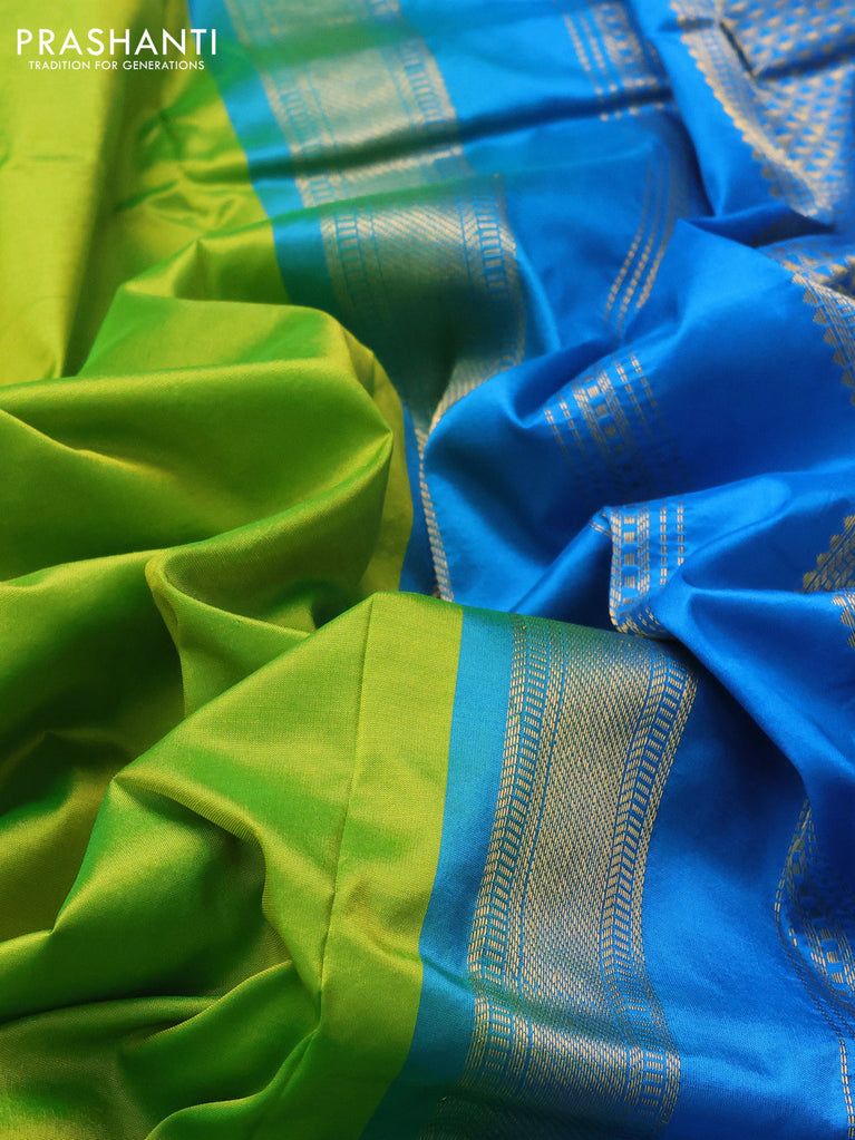 10 Yards silk saree fluorescent green and blue with plain body and zari woven border