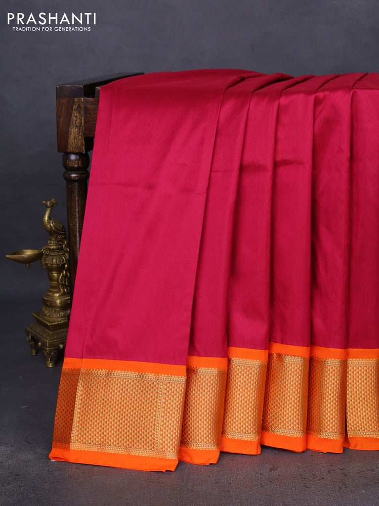 10 Yards silk saree magenta pink and orange with plain body and zari woven border