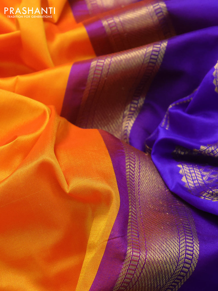10 yards silk saree mango yellow and purple with plain body and temple design annam zari woven border