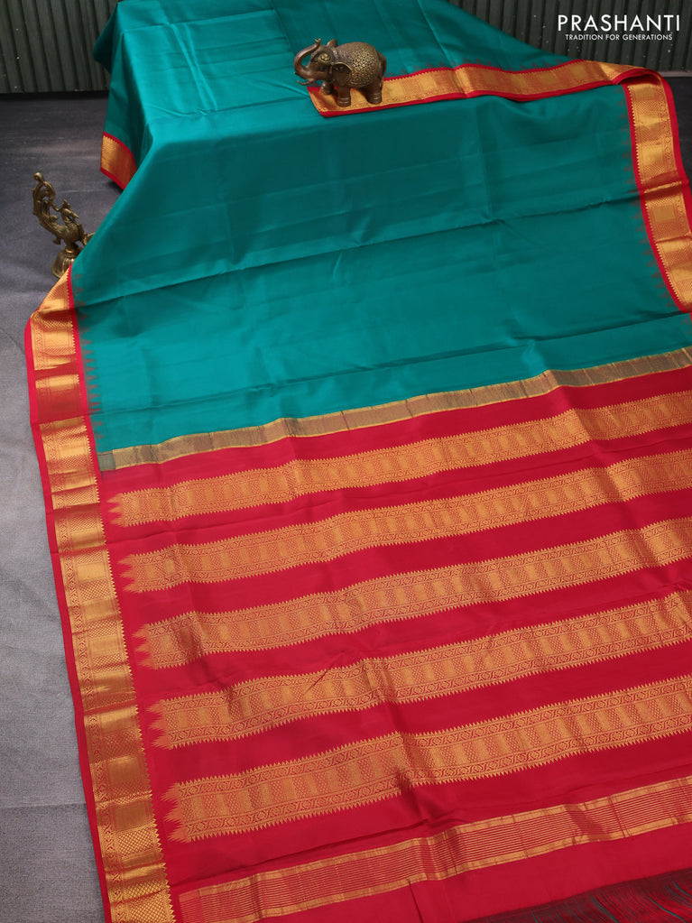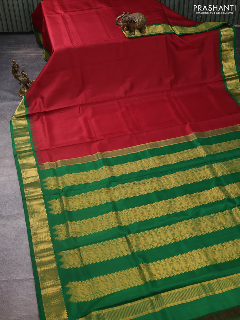 10 yards silk saree green and red with plain body and temple design zari woven border