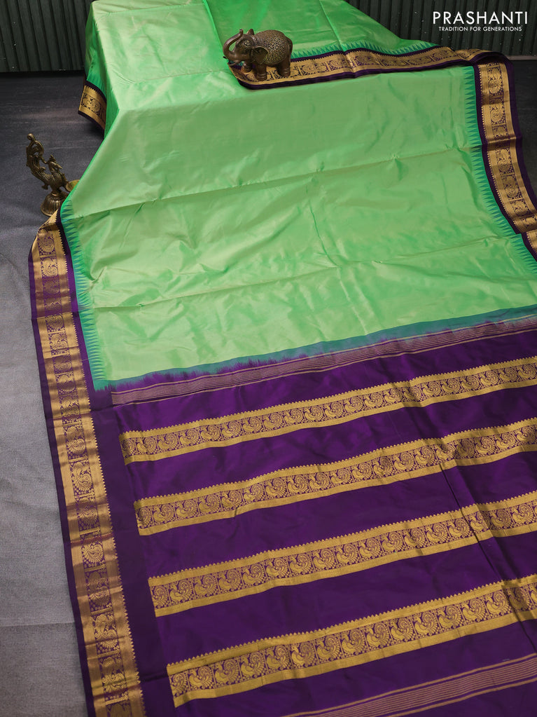 10 yards silk saree teal green and violet with plain body and temple design annam zari woven border