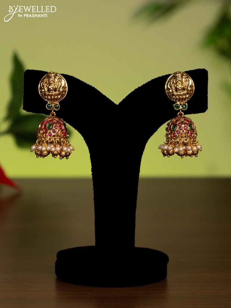 Antique attigai necklace lakshmi design with kemp stones and pearl & golden beads hanging