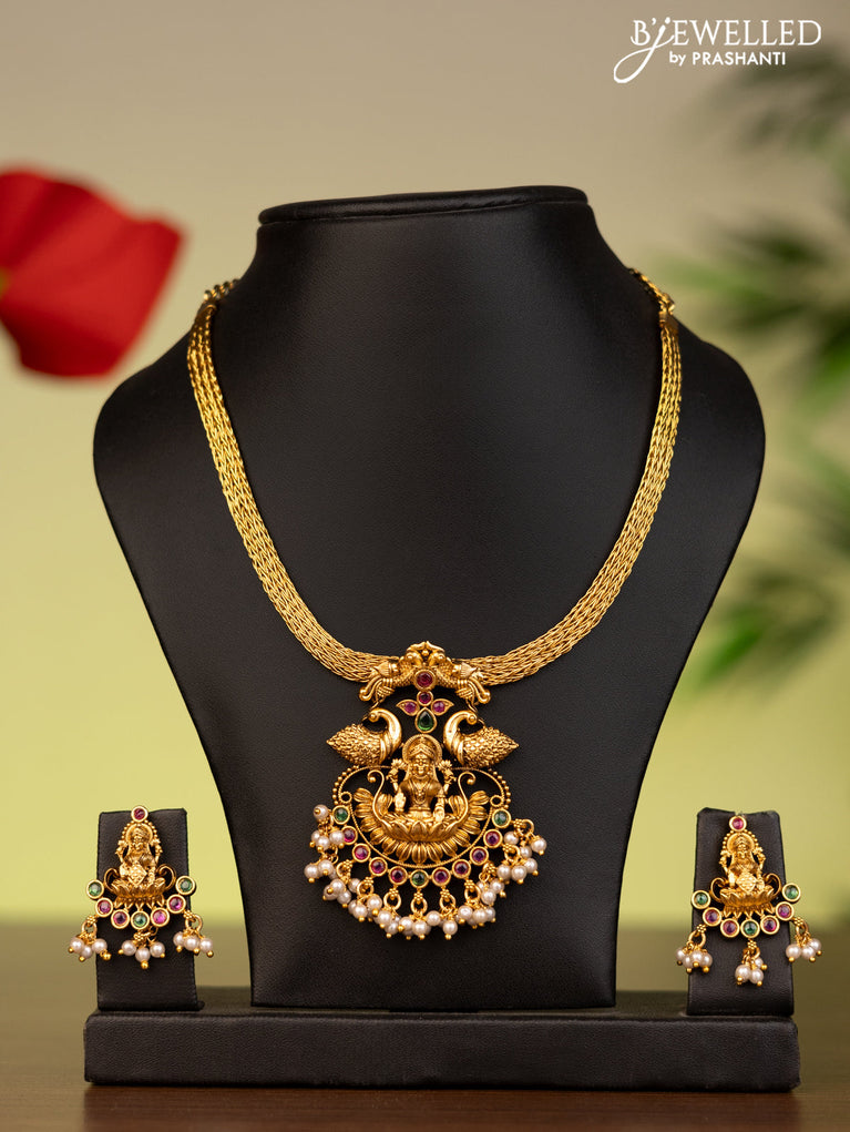 Antique attigai necklace lakshmi pendant with kemp stones and pearl hangings