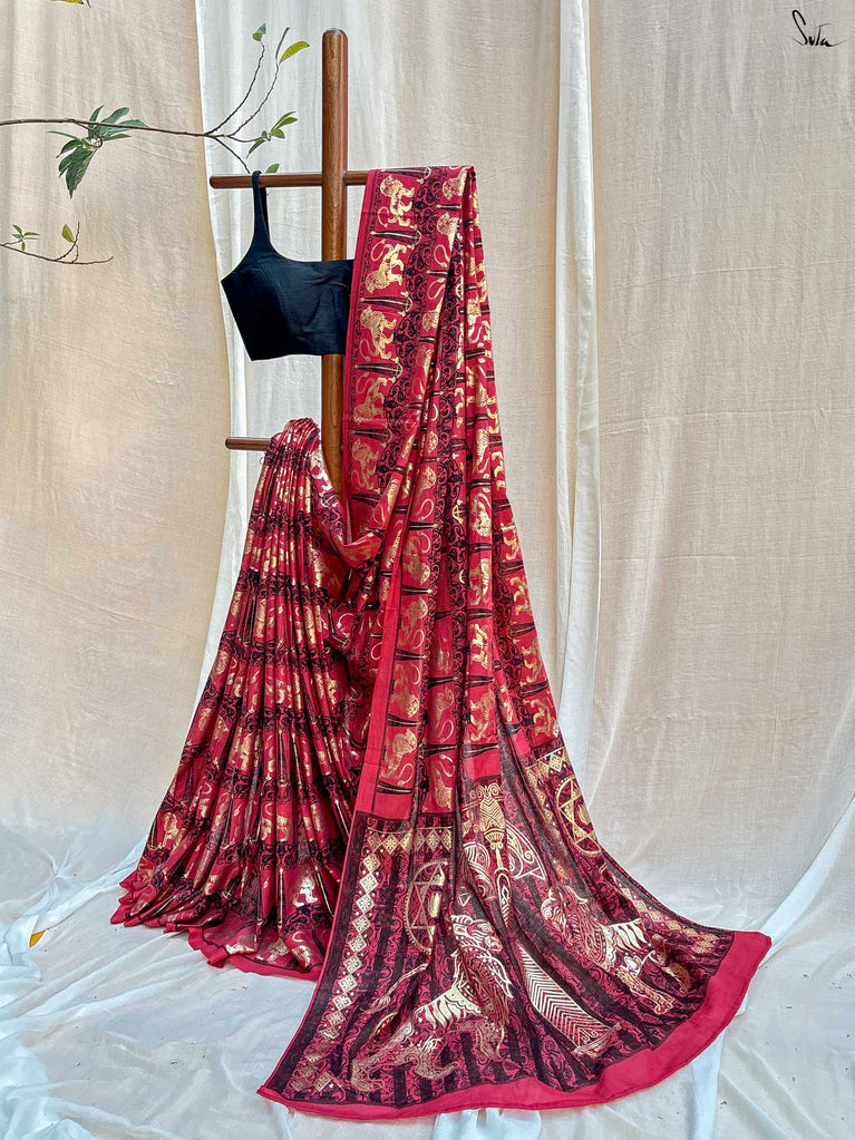 The model is wearing size XS blouse and the saree is Crimson Chaaya & Moonlit Mehfil