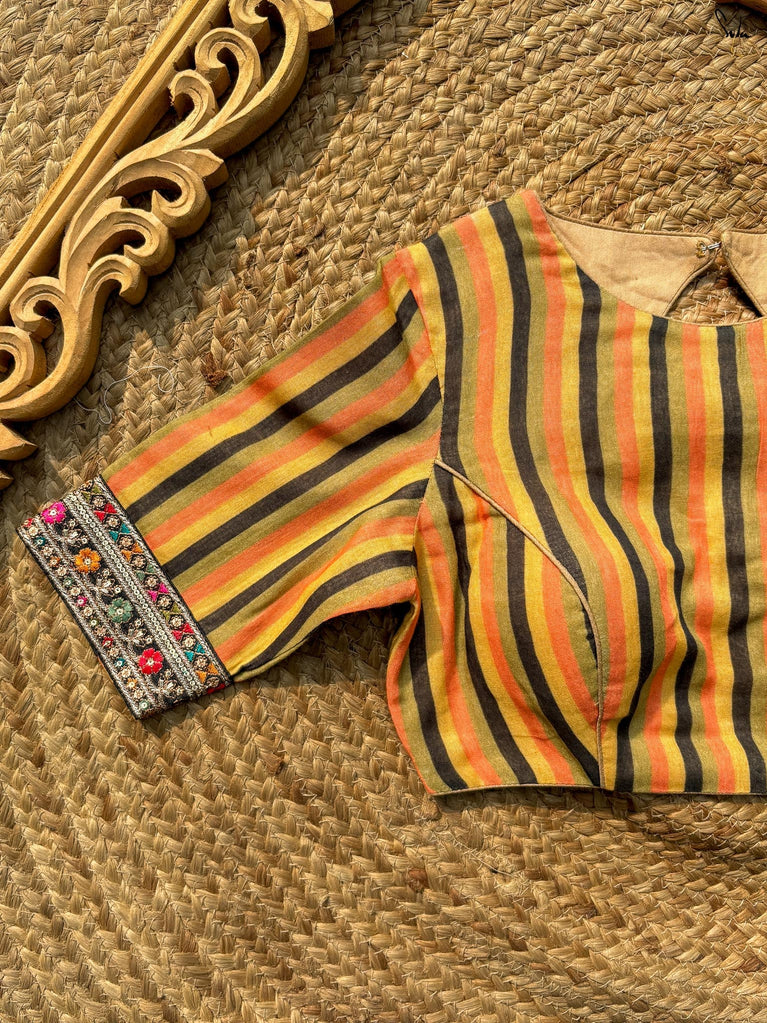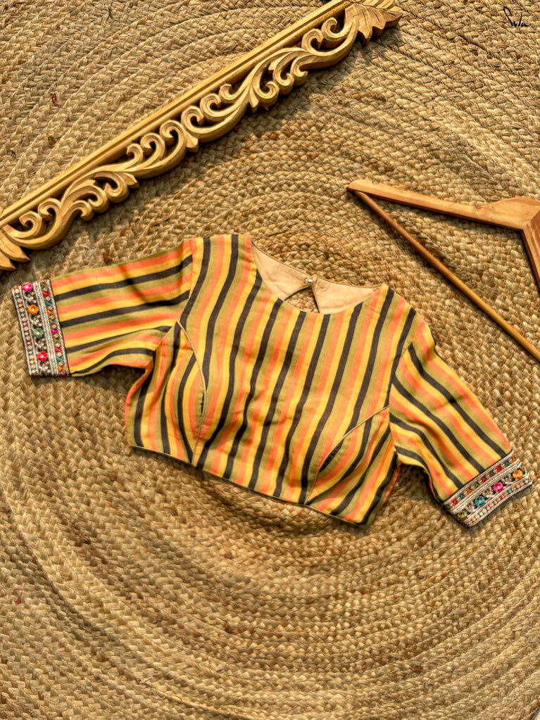 Every star needs the right canvas to shine, just like Amini needs you. This sleeveless gold blouse from Suta’s Taara collection is crafted from rich cotton silk chanderi blending excitement and modern style. The back hook-hole adds a contemporary edge, while the silver piping along the neck, armholes, and hem subtly complements your saree. Let your inner brilliance shine through with this Amini Blouse.