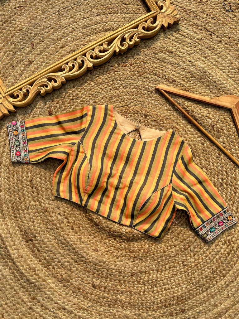 This off-white silk organza blouse features delicate gold zari stripes that lend it a subtle shimmer and graceful texture. Designed with a sleeveless silhouette and a striking halter V-neckline, it brings a modern elegance to the classic blouse. The padded structure offers shape and comfort, while the front opening ensures ease of wear.