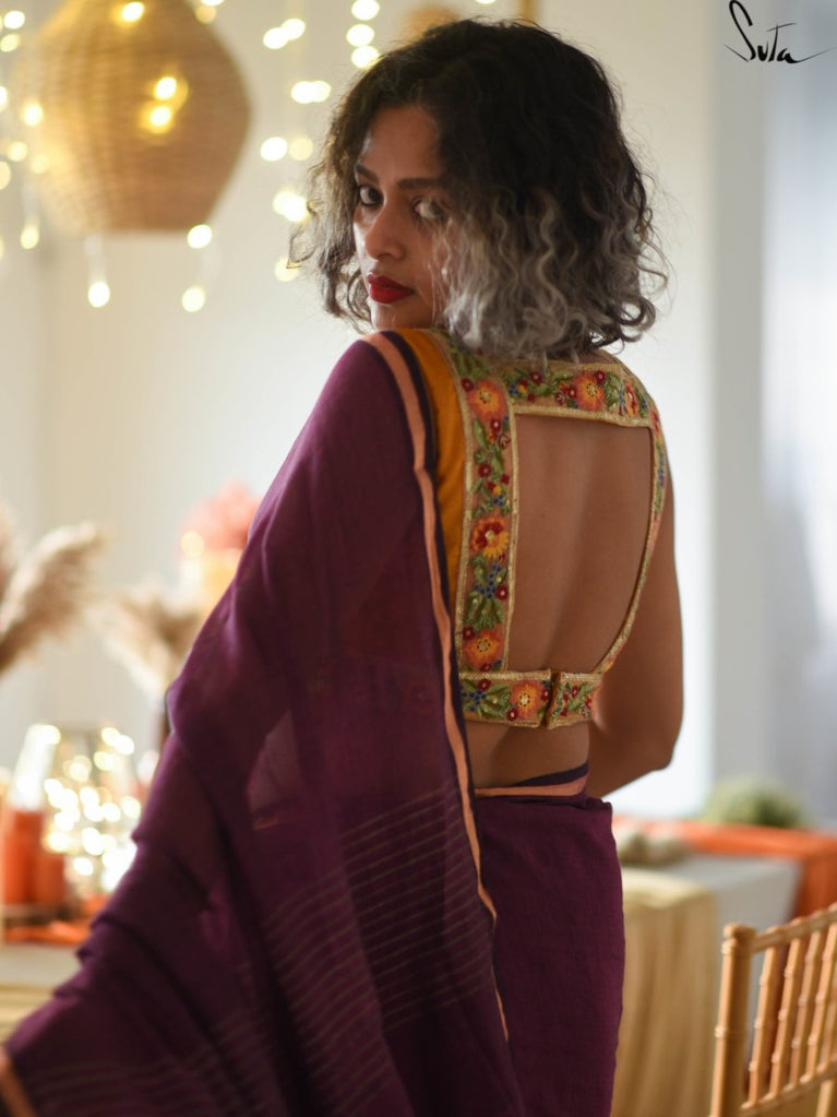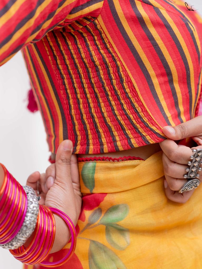 Saree: Su, the model is wearing a size S blouse and the saree called Palash Sa Basant
