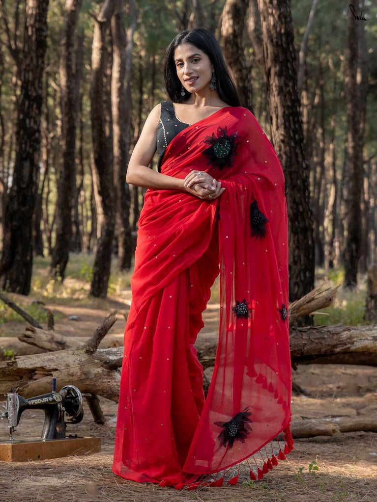 A hand-stitched 3D organza sunflower blooms gently along the saree, crafted petal by petal and finished with delicate cording. The thoughtfully placed motif rises subtly from the fabric, adding texture, depth, and a spark of handcrafted charm.