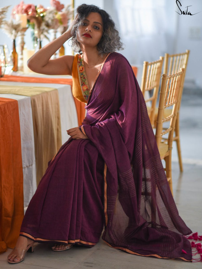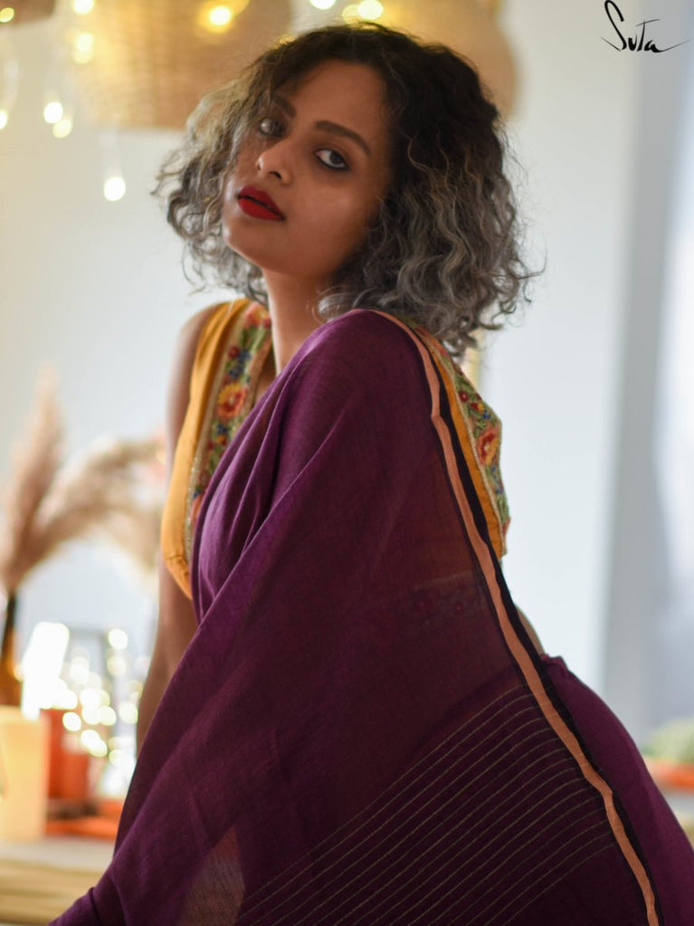 This gorgeous made-in-heaven mul cotton saree in purple with pink tassels and beautiful Ghicha lines on the pallu and zari border is enough in itself to make a stunning statement!